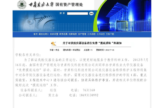 實(shí)驗(yàn)室儀器設(shè)備故障時(shí)常遇到體積大、送修麻煩等問題,給廣大師生的科研和學(xué)習(xí)帶了種種不便。為了能讓廣大師生使用安全、高效的儀器,科儀公司甘肅公司將在甘肅農(nóng)業(yè)大學(xué)舉辦實(shí)驗(yàn)室儀器設(shè)備“免費(fèi)摸底巡檢”活動(dòng)。屆時(shí)將安排維修工程師集中對(duì)學(xué)校各院系實(shí)驗(yàn)室儀器設(shè)備進(jìn)行巡檢,維護(hù)保養(yǎng)。有需要儀器維修維護(hù)的學(xué)院請(qǐng)及時(shí)與我們聯(lián)系。時(shí)間:2012年7月16日起... [查看詳情]
