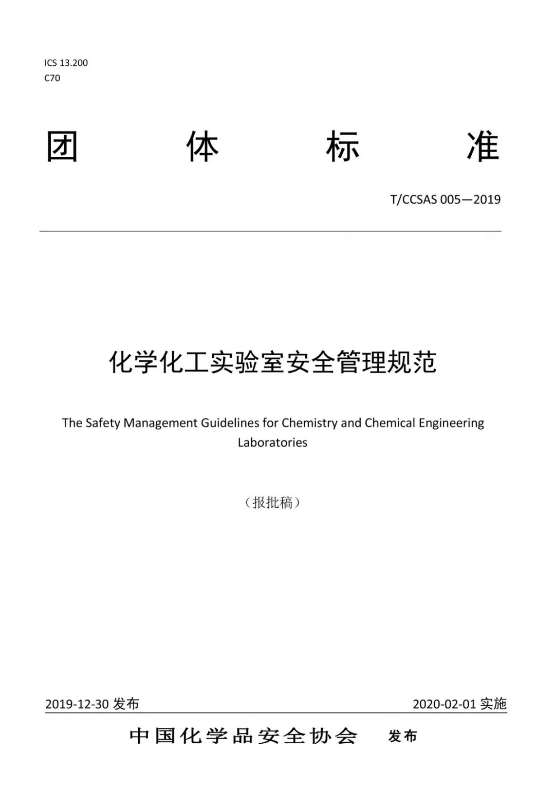 12月30日,中國化學品安全協(xié)會發(fā)布公告稱,批準發(fā)布《化學化工實驗室安全管理規(guī)范》(T/CCSAS005-2019)團體標準(以下簡稱《標準》)。該《標準》將于2020年2月1日開始實施,是國內首個關于化學化工實驗室安全管理的團體標準。